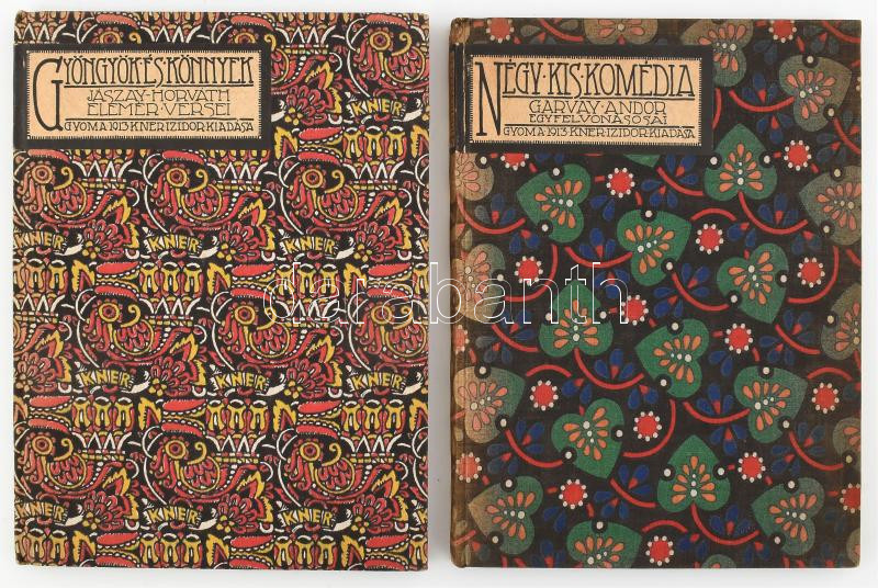 Garvay Andor: Négy kis komédia. Garvay Andor egyfelvonásosai. Gyoma, 1913. Nyomtatta és kiadja Kner Izidor. [5]-101 + [7] p. Egyetlen kiadás. Garvay Andor (1875-1927) újságíró, színműíró rövid komédiáit tartalmazza kötetünk. Színes, levélmintás Kner-vászonba kötve, a címfelirat a gerincen és az első fedőborítón sárga címkén. + -