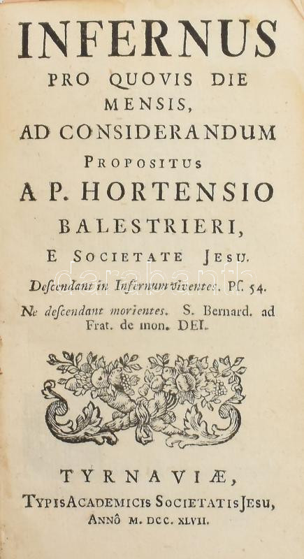 Hortensius Balestrieri műveinek kolligátuma: Mors, in singulos dies mensis. Hozzákötve: Judicum Unversale. Hozzákötve: Infernus pro quovis die mensis, ... Hovvákötve: Ultimus et beatus finis hominis in singulos dies mensis. Tyrnaviae [Nagyszombat], 1746-1747., Typis Academicis Societatis Jesu, 4+136;+198+2;194+2;+122+2 p. Latin nyelven. Korabeli egészvászon-kötésben, kopott borítóval, a borítón sérülésekkel, sérült gerinccel és kötéssel, kissé foltos lapokkal.