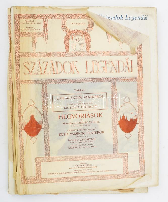 Századok legendái 1913. augusztus, októbert. Szerk.: Virter Ferenc: Benne: 1913. aug.: Déchy Mór: Hegyóriások, József Főherceg: Útiemlékeim Afrikából VI. 1913. október: József Főherceg: Útiemlékeim Afrikából VIII., Krúdy Gyula: Magyar király-idyllek. Bp., 1913, Országos Monográfia Társaság,(Hornyánszky -ny.), XXV-XLIV+31+1 p.; LXV-LXXXIV+29+1 p. Gazdag képanyaggal illusztrált. Korabeli reklámokkal. Kiadói papírkötések, a külső hártyapapír sérült.