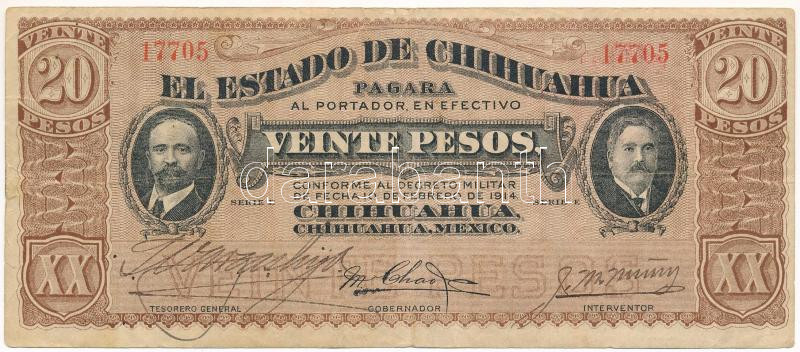 Mexikó / Forradalom / Chihuahua 1914. 20P "E" sorozat, hátoldalán felü... https://www.darabanth.com/en/474-Online-auction/474.0/Numismatics/Worldwide-banknotes~1500017/Mexiko-Forradalom-Chihuahua-1914-20P-E-sorozat-hatoldalan-felulbelyegzesekkel-T-F-kis~II3209092