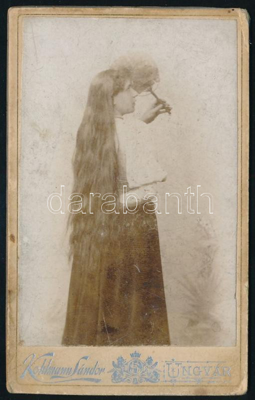 1895 Etelka, hosszú hajú lány, keményhátú fotó Kohlmann Sándor ungvári...