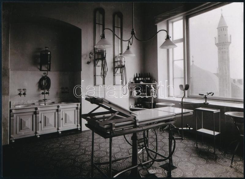 Description: cca 1890 Zelesny Károly (1848-1913) pécsi fényképész felvétele egy orvosi rendelő (műtő?) felszereléséről, 1 db modern nagyítás, jelzés nélkül, 15x21 cm