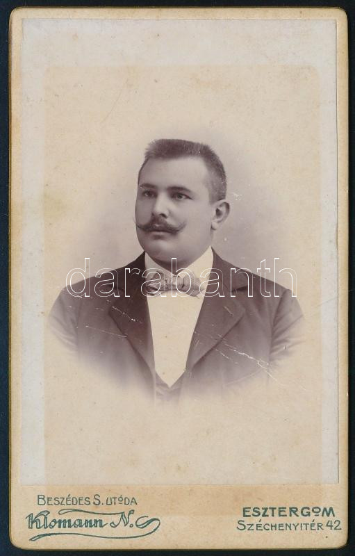 cca 1900-1910 Fiatal férfi portréja, keményhátú fotó Beszédes S. Utóda Klomann Nándor esztergomi műterméből, 10,5x6,5 cm