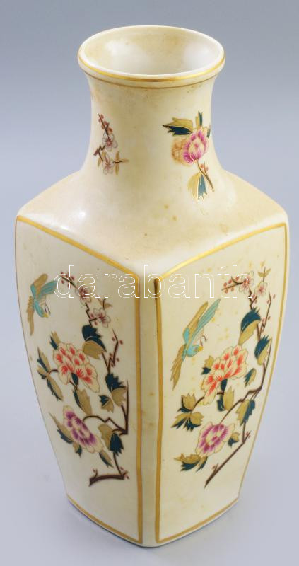Hollóházi négyoldalas váza. Aranykontúrozott madár- és virágmintával, ...