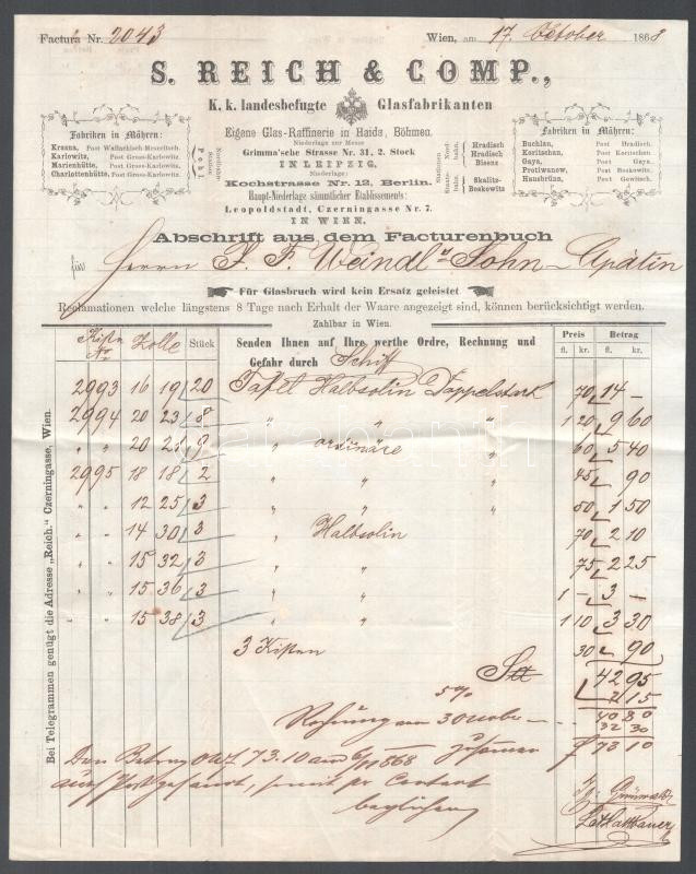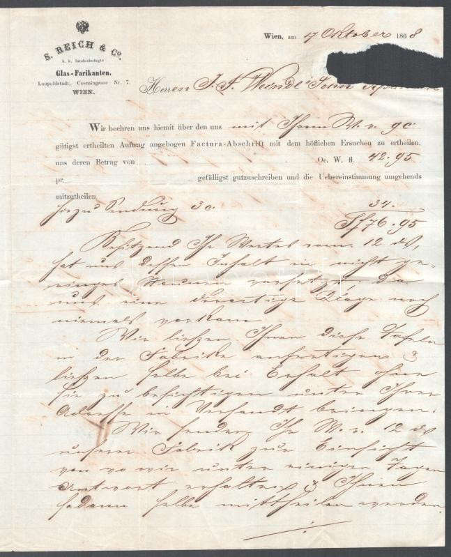 1868 Wien, S. Reich üveggyár, fejléces számla