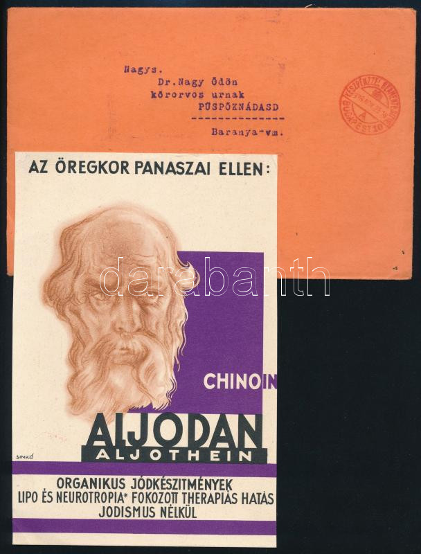 Description: 1936 ,,Az öregkor panaszai ellen: Chinoin Aljodan - Aljothein" gyógyszerreklám, grafika: Sinkó Károly (1910-1967), jó állapotban, eredeti borítékkal, 18x12 cm