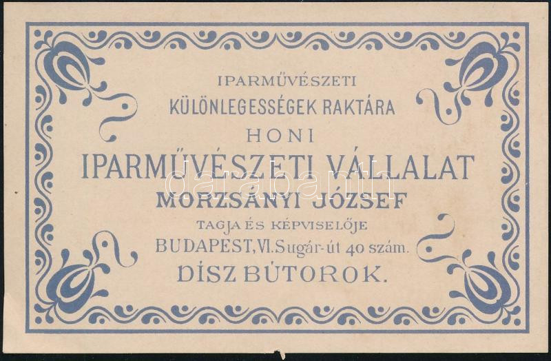 cca 1886 Iparművészeti Különlegességek Raktára Honi Iparművészeti Vállalat Morzsányi József tagja és képviselÅ‘je, Budapest, VI. Sugár-út [Andrássy-út] 40. szám. DÃszbútorok. Reklám cÃmke, 7x10 cm.