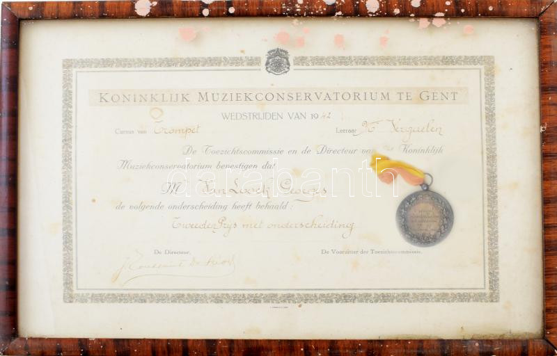 1942 A Genti Zenei Konzervatórium trombita szakán tanult hallgatónak adott érme, oklevele üvegezett keretben 46x32 cm