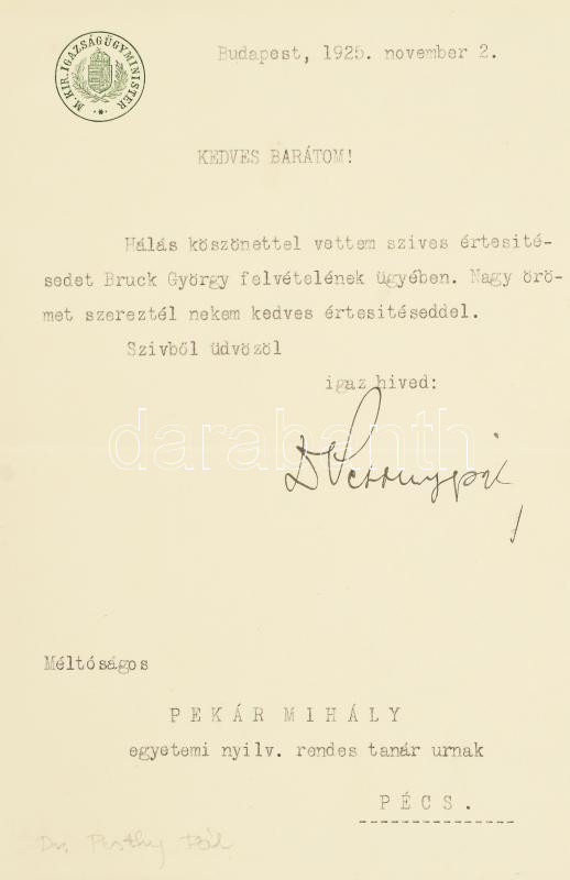 1935 Zsitvay Tibor (1884-1969) országgyűlési képviselő, korábbi igazsá... https://www.darabanth.com/en/475-Online-auction/475.0/Art-and-other-collectibles/Autographs~2000025/1935-Zsitvay-Tibor-1884-1969-orszaggyulesi-kepviselo-korabbi-igazsagugy-miniszter-kepvi~II3231369