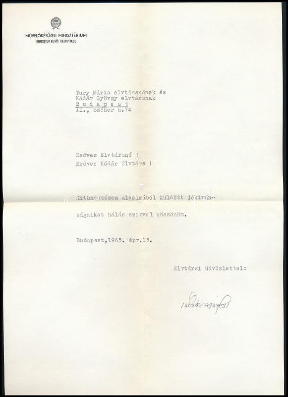 Description: 1965 Aczél György (1917-1991) kommunista kulturpolitikus aláírása egy Kádár György (1912-2002) Kossuth-díjas festő, grafikus, főiskolai tanár részére küldött levélen, fejléces papíron.