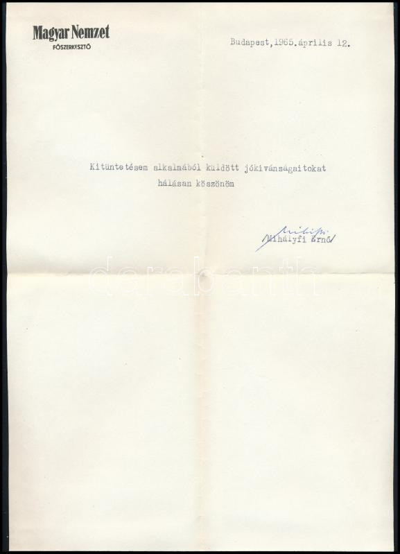 1965 Mihályfi Ernő (1898-1972) újságíró, szerkesztő (Magyar Nemzet fős... https://www.darabanth.com/en/475-Online-auction/475.0/Art-and-other-collectibles/Autographs~2000025/1965-Mihalyfi-Erno-1898-1972-ujsagiro-szerkeszto-Magyar-Nemzet-foszerkesztoje-1957-197~II3230075