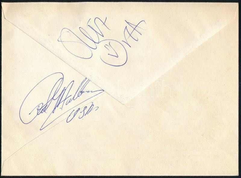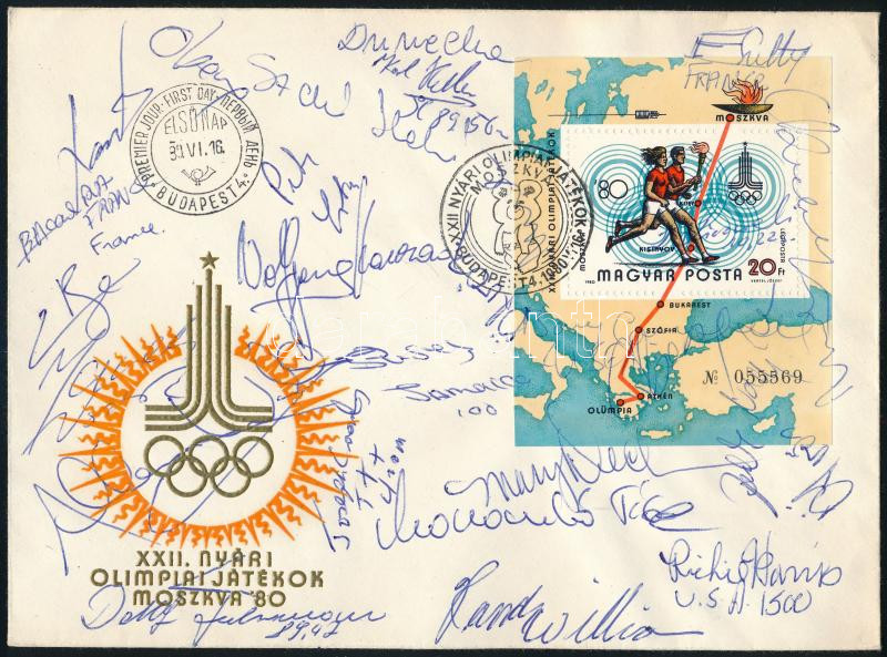 1980 Moszkvai Olimpia FDC rajta világhírű sportolók, olimpikonok, közötte amerikaiak autográf aláírásával / 1980 Moscow Olympics FDC with autograph signatures of world-famous athletes, Olympians, including Americans /
