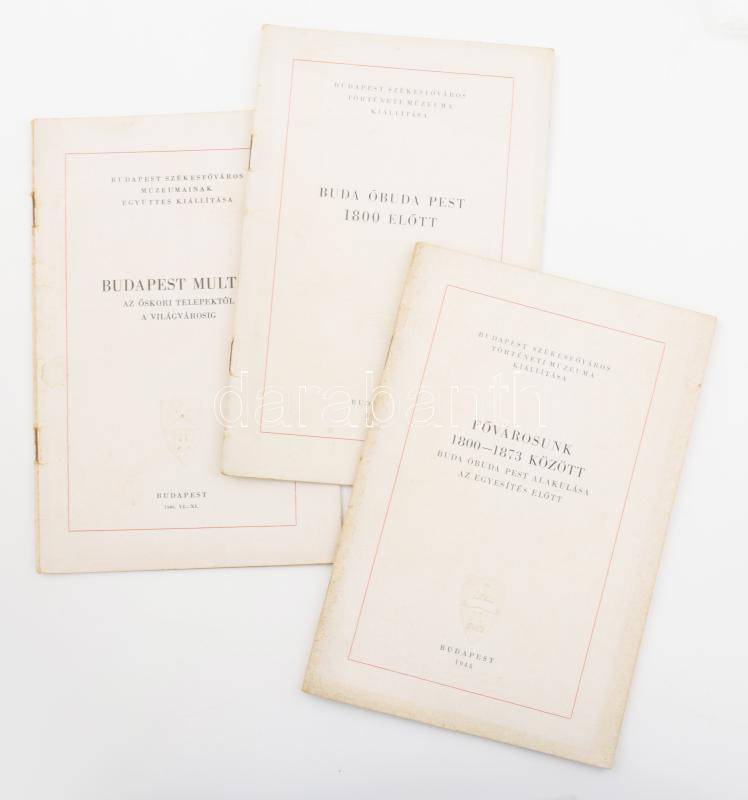 Budapest Székesfőváros Történeti Múzeuma kiállításai, 3 db: Buda, Óbuda, Pest 1800 előtt.; Budapest multja az őskori telepektől a világvárosig.; Fővárosunk 1800-1873 között. Buda, Óbuda, Pest alakulása az egyesítés előtt.; Bp., 1946-1948, Budapest Székesfőváros Közművelődési Ügyosztálya, 14 p.; 15+1 p.; 50 p. Kiadói papírkötések.