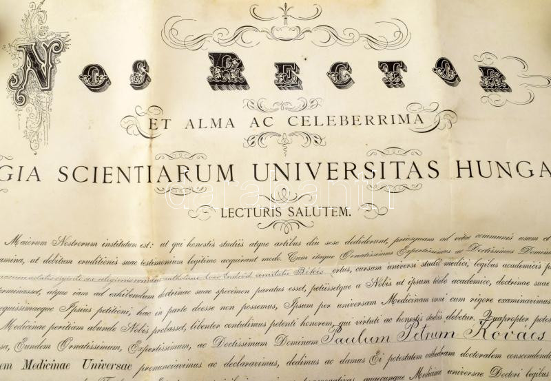 1895 Bp., a Királyi Magyar Tudományegyetem által kiállított orvosi diploma Kovács Péter Pál részére, rajta Fodor József (1843-1901) orvos, higiénikus; Hőgyes Endre (1847-1906) orvos, patológus, egyetemi tanár; Schulek Vilmos (1843-1905) orvos, szemész; ill. bókai Bókay Árpád (1856-1919) belgyógyász, farmakológus, egyetemi tanár aláírásával, 1ft okmánybélyeggel, fatokos függőpecséttel. Hajtva, kb. 65x50 cm