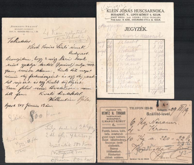 1904-1929 Kézdi-Kovács László festőnek küldött számlák, 4 db