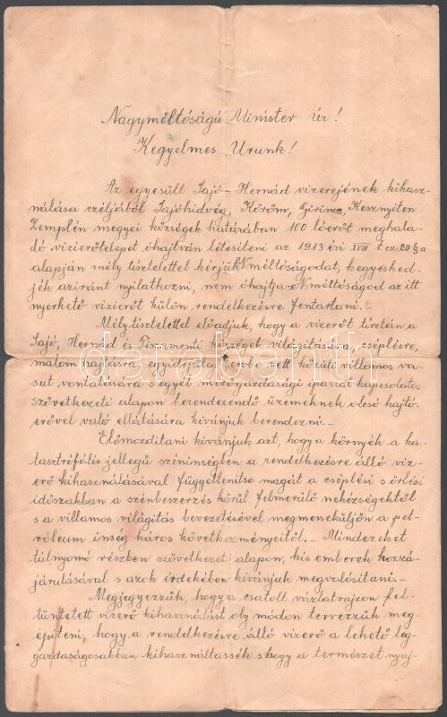 1921 Sajóhídvég Köröm, Girimes, Kesznyéten települések határában létesítendő vizierőmű létesítésére vonatkozó kérelem. Két beírt oldal