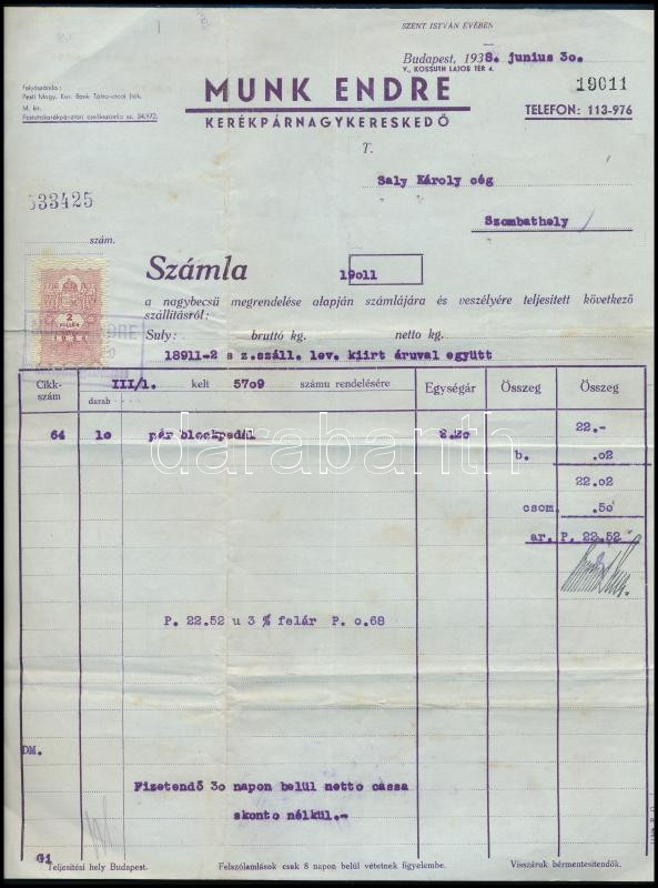 1938 Bp., Munka Endre kerékpár-nagykereskedő fejléces számlája, 2f okmánybélyeggel
