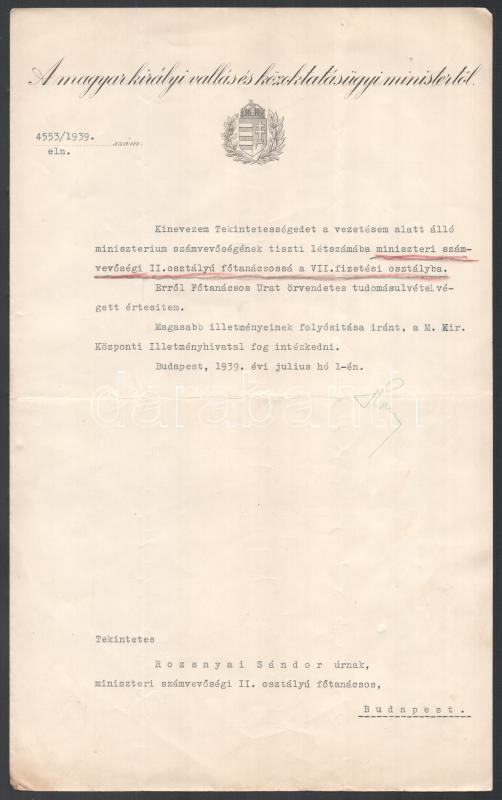 1939 Hóman Bálint (1885-1951) vallás- és közoktatásügyi miniszter autográf aláírása gépelt kinevezési levélen, fejléces papíron, hátoldalán papírfelzettel, ceruzás aláhúzással.