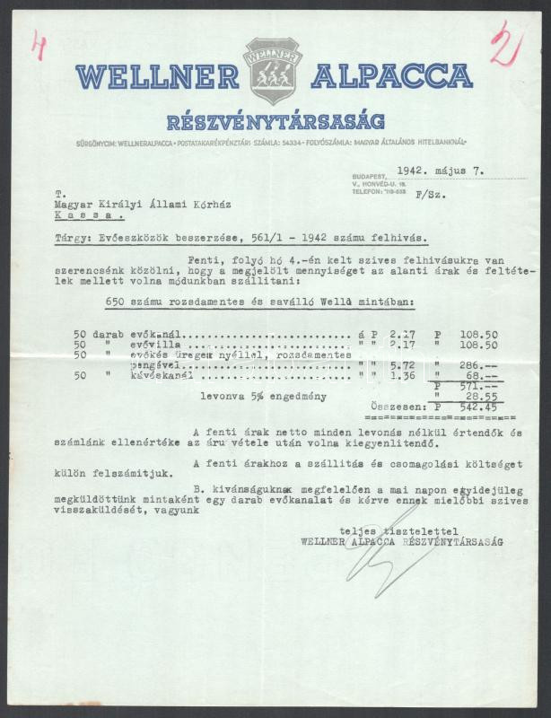 1942 Bp., Wellner Alpacca Rt. fejléces üzleti levele a kassai M. Kir. Állami Kórház részére, evőeszközök beszerzése tárgyában, vízjeles papíron