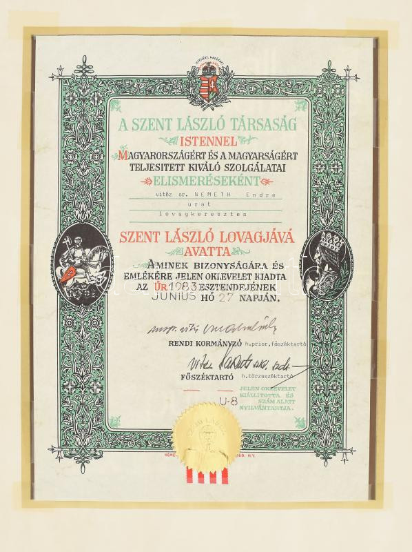 1983 Szent László Társaság, lovaggá avató oklevél a rendi kormányzó és...