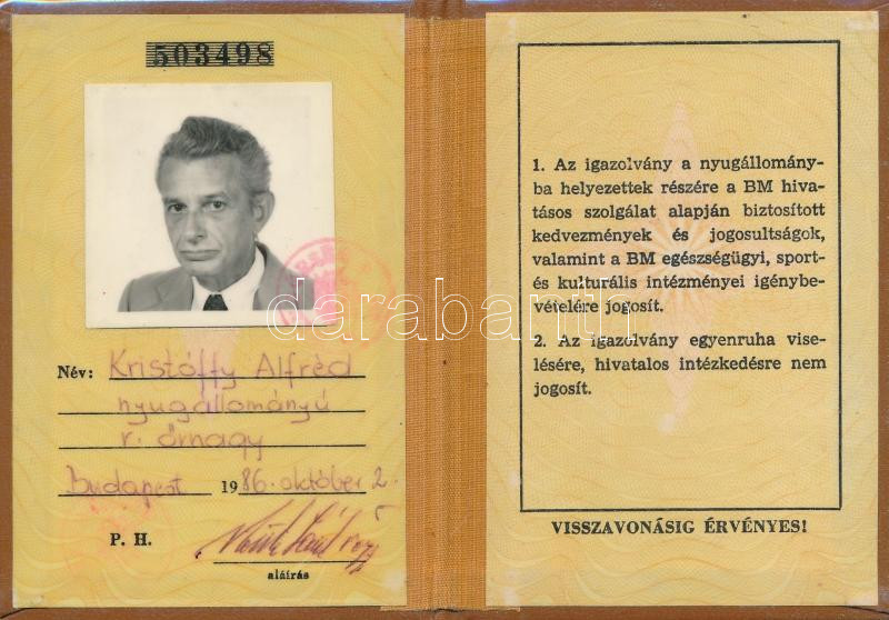 1986 Arcképes BM nyugdíjas igazolvány