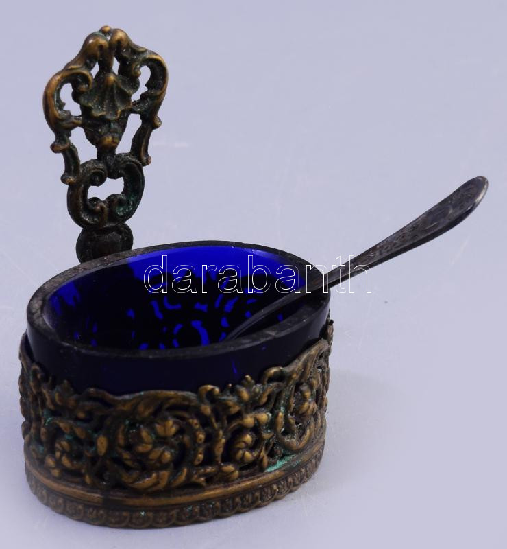 Antik fűszerkínáló kéküveg betéttel, kanállal, m: 7 cm