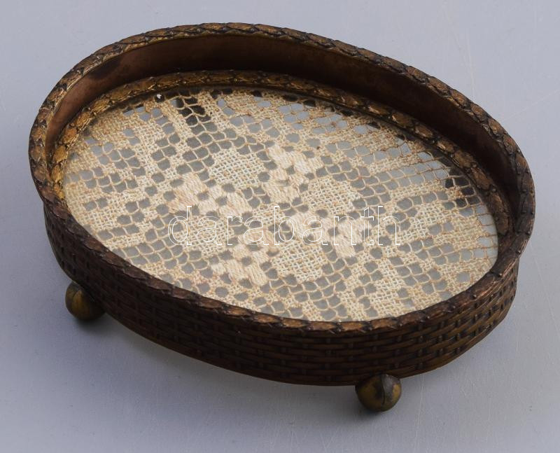 Szecessziós kosármintás ékszeres tálka, üvegbetéttel, gömb lábakon, 10,5x8 cm