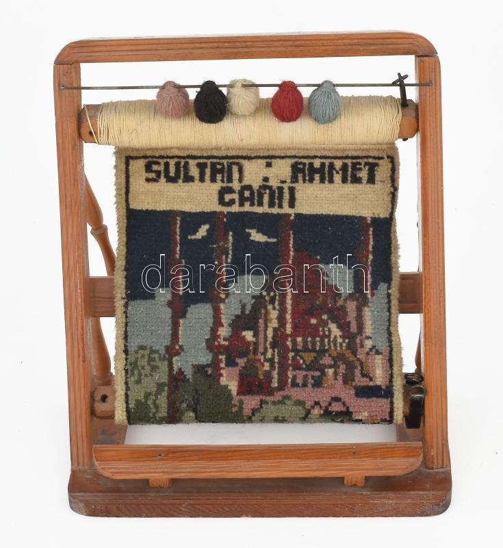 Szuvenír szövő makett, rajta kelimen Ahmed szultán dzsámijának ábrázolásával, sérüléssel, m: 32 cm