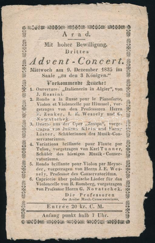 1835. december 9. Arad, Adventi koncert műsora az Aradi Zenei Konzervatóriumban, német nyelven. 12x5x20,5 cm