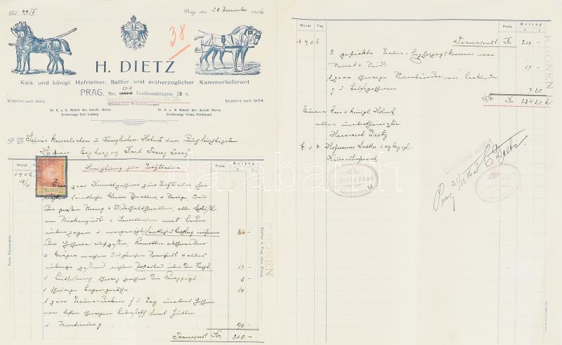 1906 Károly főherceg részére szállított lószerszámok számlája H. Dietz udvari szállítótól rányomtataott 10h illetékbélyeggel / Invoice for horse tools delivered to Archduke Károly from court supplier H. Dietz with printed document stamp