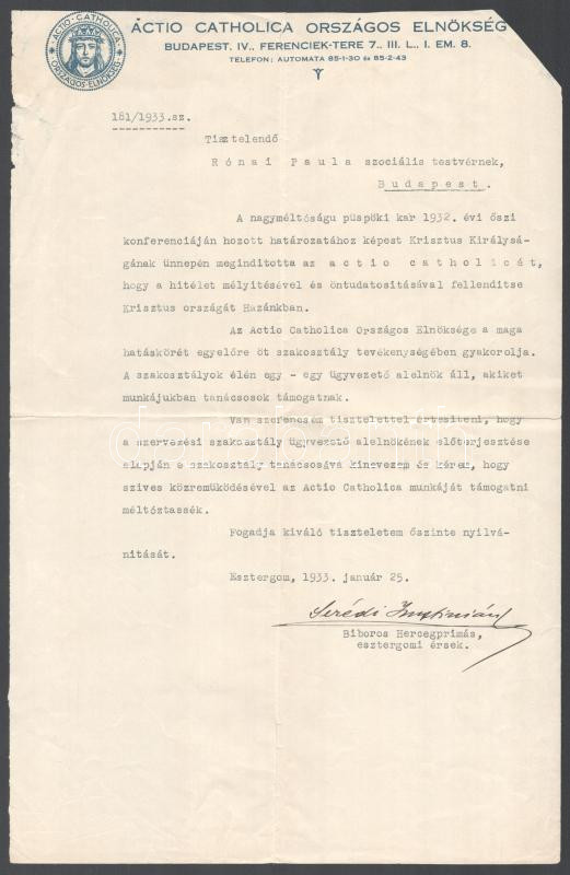 1933 Serédi Jusztinián (1884-1945) bíboros hercegprímás levele, amelyben Rónai Paula szociális testvért az Actio Catholica tanácsosává nevezi ki. Egy géppel írt oldal Actio Catholica fejléces papírján, Serédi Jusztinián autográf aláírásával. Jobb felső sarkában vágott. Szakadásokkal.