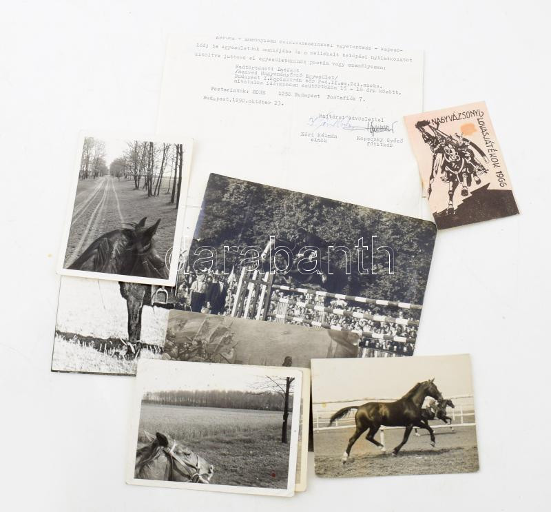 1963-1977-1990 Vegyes lovas tétel, közte 7 db különféle fotó, közte az egyik pecséttel jelzet (Bojár Sándor), nagyrészt a hátoldalakon feliratozva, az egyik szakadt, 12x9 cm és 13x18 cm. Valamint Nagyvázsonyi Lovasjátékok jegye (1966), Mátyás király lovon (Helbing Ferenc festményének nyomata), valamint a Honvéd Hagyományörző Egyesület (HOHE) körlevele, aláírásokkal.