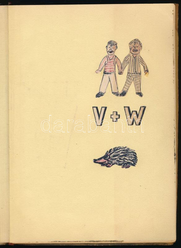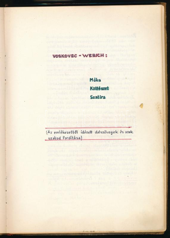 1967 Jiří Voskovec és Jan Werich cseh avantgárd színészek dalszövegeinek cseh szövege és magyar fordítása, idézte és ford.: Rédey Tibor, kb. 40-50 kézzel írt oldal, kissé viseltes füzetben, foltos borítóval