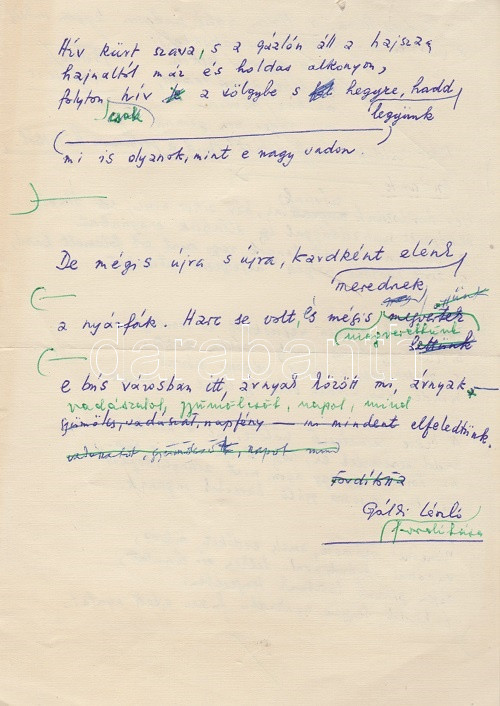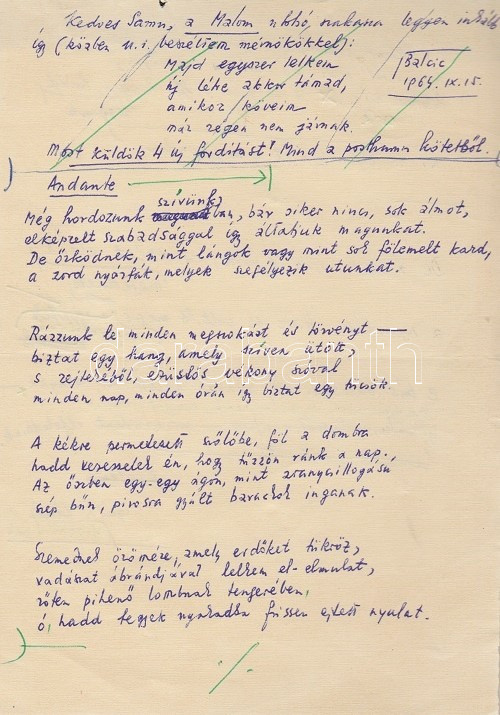 Gáldi László (1910-1974) nyelvész, irodalomtörténész, műfordító Lucian Blaga (1895-1961) román költő ,,Andante" című költeményéről készített műfordításának saját kézzel írott, két oldal terjedelmű, saját kézzel javított eredeti kézirata. Kelt: Budapest, 1964 körül. Egyetlen levél, mérete: 200x142 mm, 33 beírt sor. Lucian Blaga (1895-1961) a XX. század egyik legjelentősebb román gondolkodója, változatos élete során újságíró, költő, drámaíró, diplomata, egyetemi tanár és kultúraszervező, 1948 után könyvtáros és műfordító volt. Élete során hét verseskötete jelent meg, de 1948 után hallgatásra ítélték, az utolsó két évtized (1943-1961) versei csak halála után jelentek meg. Az expressszionista szabadversekkel induló Lucian Blaga hamar utat talált a mély gondolati tartalmakhoz és a kötött formákhoz, egyszersmind a román-magyar-szász együttélést szorgalmazó Blaga jelentőségét hamar felismerték a transzilvánista erdélyi magyar költők: méltatása és fordítása már az 1930-as években megkezdődött - Dsida Jenő, Áprily Lajos, Szemlér Ferenc tolmácsolta sok versét. Első reprezentatív verseskötete magyarul az 1960-as évek derekán, a román-magyar kulturális kapcsolatok kedvező idejében, az Európa Könyvkiadónál jelent meg, melybe a költő életében megjelent hét verseskötet válogatott versei mellett a hallgatásra ítélt korszak (1948-1961) költeményei is bekerültek. A ,,Mágikus virradat" címen megjelenő Blaga-versválogatás Domokos Sámuel válogatásában és előszavával jelent meg (Budapest, 1966). Áprily, Jékely Zoltán és Szemlér fordításai mellett Baranyi Ferenc és a jeles romanista Gáldi László fordította a versek zömét, Gáldi László nyelvész az érett (és hallgatásra ítélt) Blaga költeményei közül fordított. Tételünk, az ,,Andante" című költemény a gyűjtemény 282-283. oldalán jelent meg. A műfordítás előtt 7 sornyi üzenet Domokos Sámuelhez, a kötet szerkesztőjéhez, utólagosan zöld tintával áthúzva. Jó állapotú lap.