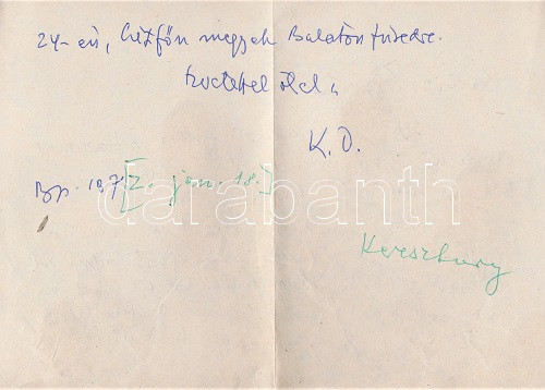 Keresztury Dezső (1904-1996) költő, műfordító, irodalomtörténész saját kézzel írt, két oldal terjedelmű szerkesztői jegyzete Belia György (1923-1983) Babits-kutatóhoz, szerkesztőhöz, a Babits-kiadások szöveggondozójához, a Hazám!-ciklus közölhetőségével kapcsolatban. Kelt: (Budapest, 1972. január 18). Egyetlen levél, mérete: 132x182 mm, 13 beírt sor. Babits Mihály szövegeinek utóélete kalandos, amennyiben már a költő életében, és a költő halála után is betiltották egyes szövegeit. A korai, sőt az érett-Kádár rendszer is veszélyesnek ítélte egyes verseit, így a költő egy gondosan megkomponált verseskötetéből (Sziget és tenger, 1925) rendre kimaradtak fontos szövegek. Így a Hazám!-ciklus ,,a szomszéd népek érzékenységére" való tekintettel egészen az 1977-es kiadású Babits-összesig kimaradt a válogatásból, és még ott is öt sort kipontozott a központi utasítás. Keresztury Dezső és Belia György 1972 eleji levélváltására a soron következő Babits-válogatással kapcsolatban került sor (Húsvét előtt, Szépirodalmi, 1973 - Olcsó könyvtár sorozat). Feljegyzésünk szövege a érett kádári rendszer (ön)cenzurális gyakorlatának dokumentuma: ,,Kedves Gyurka! Egyetértek a javaslatoddal; a Hazámat én is ki akartam cserélni; a többivel sem akartam túllépni a határt." Jó állapotú levél, félbehajtva.