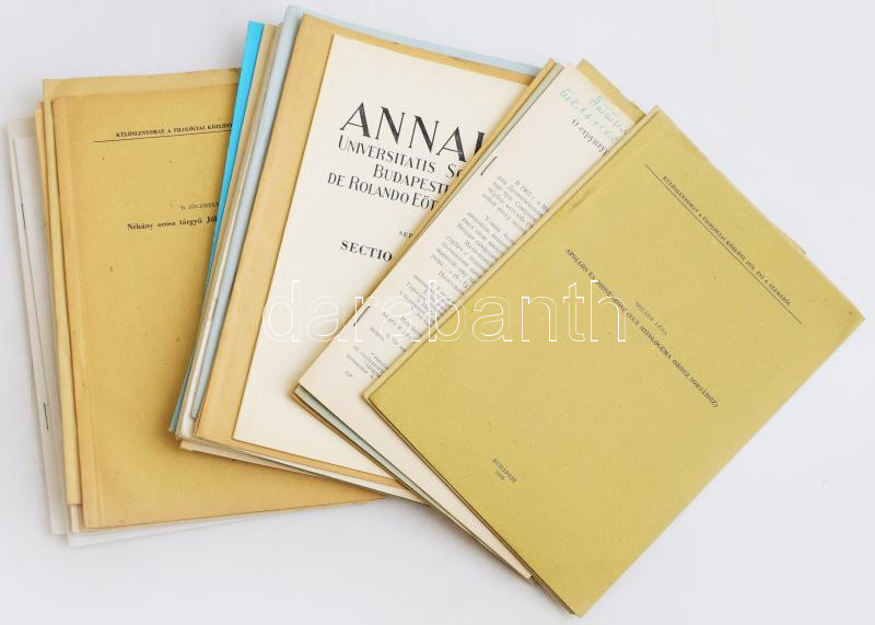 Vegyes dedikált különlenyomat tétel, 25 db, klasszika-filológia, nyelvészet, irodalomtörténet témákban. Közte H. Tóth Imre (3 db.), Az egyikben H. Tóth Imre autográf levelével.), Szilárd Léna (4 db), Papp Ferenc (2db), Gregor Ferenc (4 db), Király Péter (2 db), Péter Mihály, Tétényi Mária, Király Gyula, D. Zöldhelyi Zsuzsa, Szabó Péter, Dukkon Ágnes, Tüskés Gábor, Szabó K[álmán], Han Anna DEDIKÁCIÓIVAL 3 kivételével Hollós Attila (1933-2023) nyelvész részére.