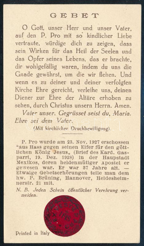 cca 1928 Boldog Miguel Pro (1891-1927) mexikói jezsuita szerzetes erek...