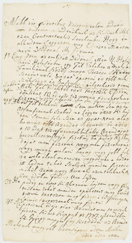 Description: 1785 Nagyhalász Eleizer Márton zsidó és Csuha Tamás közötti szerződés, melynek értelmében Csuha telkére épít Eleizernek egy házat melyért az 10 forint árendát fizet, cserébe ott háborítatlanul lakhat>