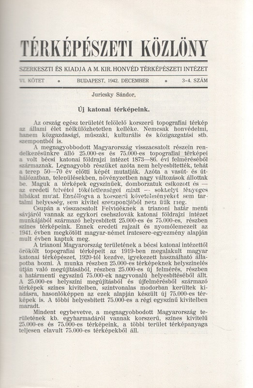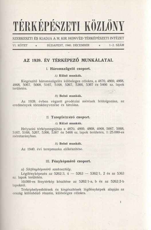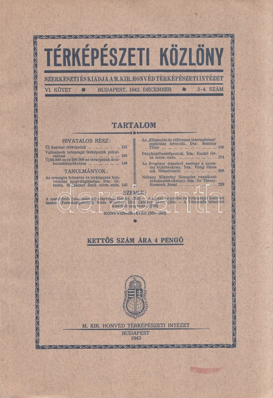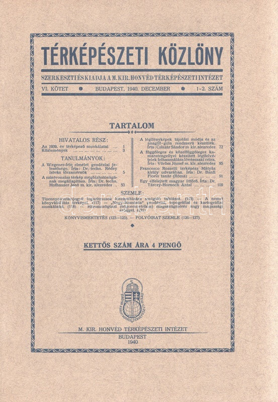 [Folyóirat] Térképészeti Közlöny. VI. kötet, 1-4. füzet. [Teljes, két kötetben.] Budapest, 1940-1943. Magyar Királyi Honvéd Térképészeti Intézet (ny.) 127 + [1] p. + 10 térkép (5 kihajtható, ebből egy kétszínnyomású); [129]-266 p. + 2 melléklet (kihajtható irányrózsa légi tájékozódáshoz). A Térképészeti Közlöny a Magyar Királyi Honvéd Térképészeti Intézet szakfolyóirata, mely ,,Hivatalos rész" rovatában a hivatal működéséről adott híreket, ,,Tanulmányok" rovatában a felmérés, térképezés, térkép-előállítás, iskolai kartográfia tárgykörébe eső cikkeket közölt, bibliográfiai szempontból is számottevő ,,Szemle" rovatában méltatta a megjelenő térképeket. Az 1930-ban alapított folyóirat 1950. évi megszűnéséig évente négy füzetben jelentkezett. Gazdagon illusztrált évfolyamszámainkban hosszabb tanulmány a légi térképezésről, illetve az ország térképezésének katonai vonatkozásairól. Művelődéstörténeti tanulmányok Francesco Rosselli térképészről, Mátyás király kartográfusáról, illetve Mikoviny Sámuel bányamérnökről. Fűzve, egységes, feliratozott kiadói borítóban. Jó példány.