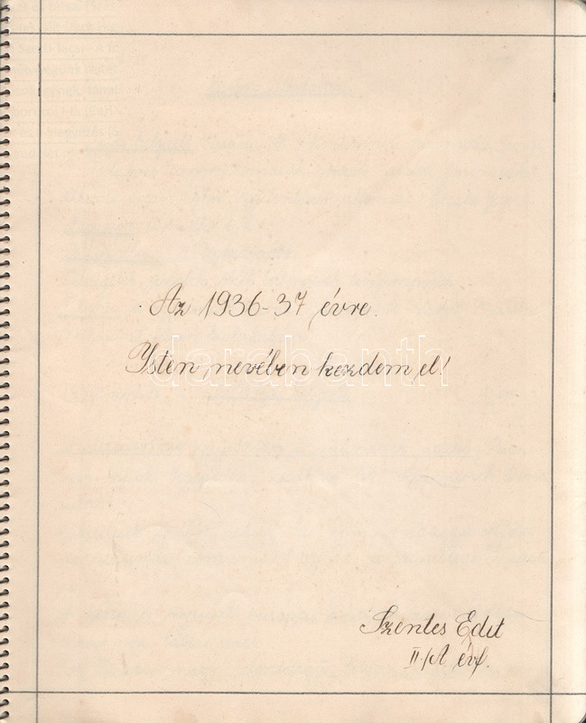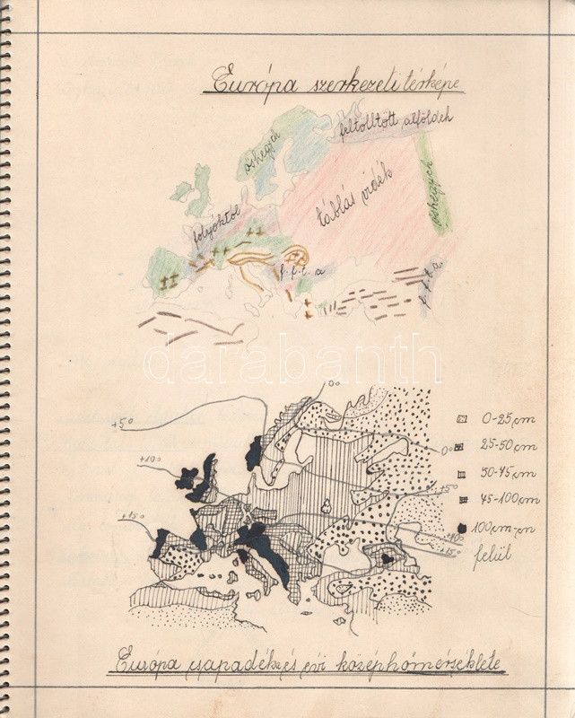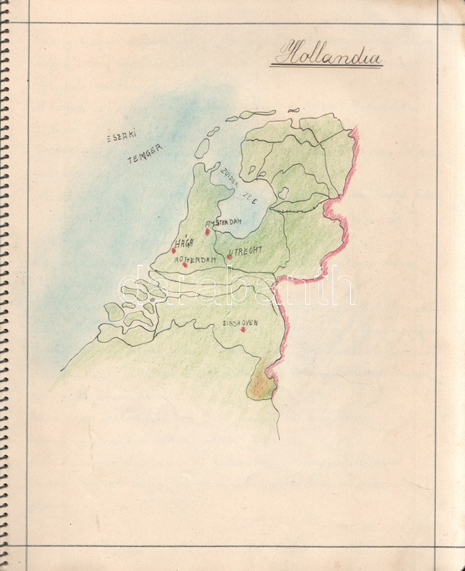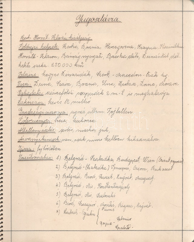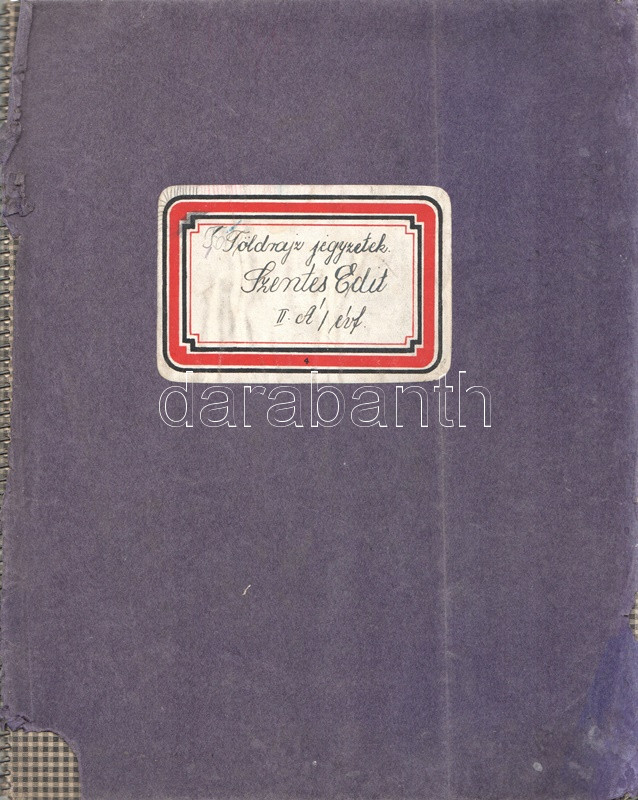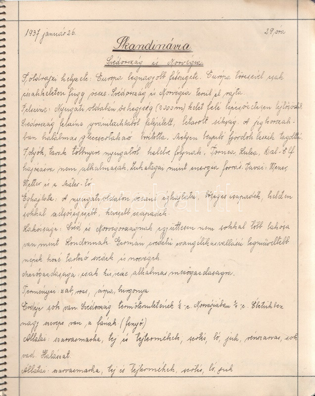 [Kézirat] Földrajz jegyzetek. Szentes Edit II/Á. osztályos növendék kézírásos, színes térképekkel gazdagon illusztrált földrajzórai füzete (1936-1937). [Hely nélkül], 1936-1937. Terjedelme [50] levél. Szentes Edit gimnáziumi tanuló kézzel vonalazott, színes térképvázlatokkal gazdagon illusztrált földrajzfüzete emlékezetes bepillantást nyújt a hazai földrajzoktatás korabeli világába. A heti két órában tartott földrajzórák 1936 őszi-téli félévében Európa országainak legfontosabb természet- és gazdaságföldrajzi adatait ismertették. A füzet a Magyar Hiszekegy szövegével indul, melyet a történelmi Magyarország térképe kísér. Füzetünk alighanem római katolikus tanintézetben készült, erre utal az Európa általános jellemzésének vallási adatolásából való részlet, mely a 200 millió főt kitevő katolikus felekezet országai közé sorolja Magyarországot. A Cholnoky Jenő ismeretterjesztő hatását mutató földrajzórák először általánosságban tárgyalják a kontinens geológiai és meteorológiai szerkezetét (térképekkel), majd az ötödik órától az egyes országok ismertetése következik, államformája, főbb városai, főbb vizei, felszínformája, éghajlata és korabeli lakossága adatolásával, mely információkat a gazdasági részletek követik, első helyen mezőgazdasága és állattenyésztése, erdőgazdálkodása, majd ásványkincsei, ipara és kereskedelme és természetesen vasútvonal-hálózata részleteivel. Jellemző részlet a Jugoszlávia-ismertetésből: ,,Montenegró (Csernagóra). Legkisebb tartomány. Felszíne: kopár mészkőhegyek. Termelése: kevés, a szükségletet sem fedezi. Állatok: kecske. Lakossága: kevés, műveltségben elmaradott, harcias, szabadságszerető. Gazdasági jelentősége: csekély. Városai: Centinje, Podgorica". A történelmi vagy gazdasági, hatalmi szempontból fontosabb országok bővebb kifejtést kapnak: Jugoszlávia alkotóelemeiből Horvát-Szlavónország egy teljes óra anyaga, a baráti Olaszország, illetve a hatalmi szempontból kihagyhatatlan Franciaország, illetve Oroszország több órányi kifejtést kapnak. (Szerzőnk alighanem hiányzott Németország tárgyalása idején.) Az órai anyagot további 16 egész oldalas, kézzel rajzolt, színes vaktérkép kíséri a fontosabb államokról. Jó állapotú spirálozott füzet, védőborítóban, az első fedőborítón kézzel feliratozott címkével.