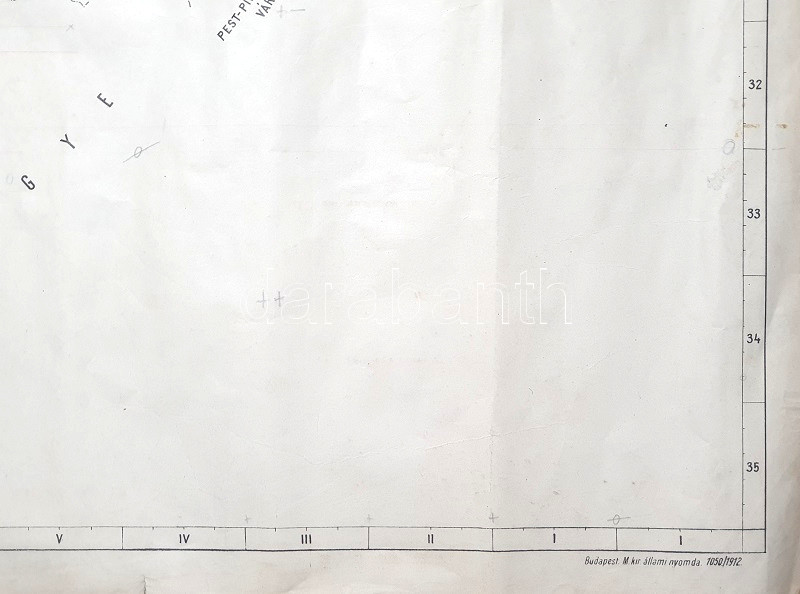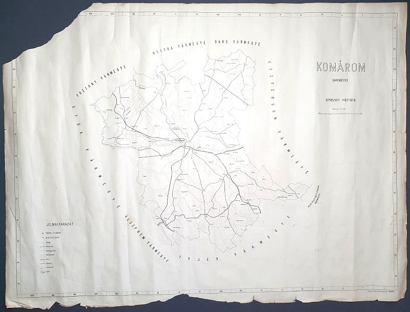 [Térkép] Komárom vármegye átnézeti vázlata. Méretarány: 1 : 144,000. (1912). Budapest, 1912. Magyar Királyi Állami Nyomda. Mérete: 685x945 mm egy 760x1020 mm méretű térképlapon. A döntően adóügyi célzattal készülő térképezés évtizedes gyakorlata volt, hogy az egyes vármegyékről készült, nagy felbontású, nem a teljes vármegyét ábrázoló térképek mellett az áttekinthetőség érdekében a vármegyékről készítettek egy egylapos, úgynevezett áttekintő térképet is, mely a résztérképekről csak a legfőbb adatokat vette át. Az 1856. évi felmérési utasítás szellemében az áttekintő térképeket egységesen 1: 144.000 méretben vették fel, az ország teljes vármegyetérkép-kollekciója az egységesítési elvek kidolgozása után 1910-1912-ben készült el. Dokumentumunk a kollekció Komárom vármegyei áttekintő térképe. Egyszínnyomású térképünk a vízrajzi részleteken kívül feltünteti a törvényhatósági jogú városokat, a rendezett tanácsú városokat, a községeket a községhatárokkal; a vasutakat, az elsőrendű állami és az alsóbbrendű törvényhatósági utakat (térképünk közlekedés- és vasúttörténeti szempontból értékes pillanatfelvétellel szolgál - a Duna két oldalán haladó vasútvonalak összekapcsolására nem került sor). Jóllehet térképünk nem közöl domborzati adatokat, és úgyszintén mellőzi a művelési ágak, bányák, források, fürdők feltüntetését, ám a sok példányban készült áttekintő térkép lehetőséget adott a kívánt adatok felvitelére: ezért is maradt nagy hely a címfelirat két sora, térképünk esetén a ,,Komárom vármegye" és az ,,átnézeti vázlata" címsorok között. Amennyiben tehát példányunk a helyi szőlészet adataihoz készült volna, úgy a szőlészet adatainak kézi topográfiai felvétele után kiegészíthető lett volna a ,,szőlészeti" címsor-adattal. Átnézeti megyetérképünk további érdekessége, hogy keretén nem földrajzi fokbeosztás található, hanem az 1856. évi utasítás óta használatos négyzetmérföld-beosztás, és skálázása is szokatlan. A térkép vízszintes keretén arab, függőleges keretén római számok szerepelnek. A vízszintes arab számozás a gellérthegyi meridiánnak tekintett kezdő délkörtől kezdődik, a függőleges római számozás az ország legészakabbi pontjától a legdélebbi pontjáig haladva nő. Példányunkon az egykori tulajdonos vörös és fekete színnel további fokbeosztásokat helyezett el, valamint a Vértes északi oldalán meghúzódó községek határait több jelzéssel látta el. Térképünk bal felső sarkán kisebb hiány, dokumentumunk alján apró hiány, mely a szövegtükröt nem érinti, a térképszélen apró gyűrődések. Hungaricana: B IX a 1944. Jó állapotú lap.