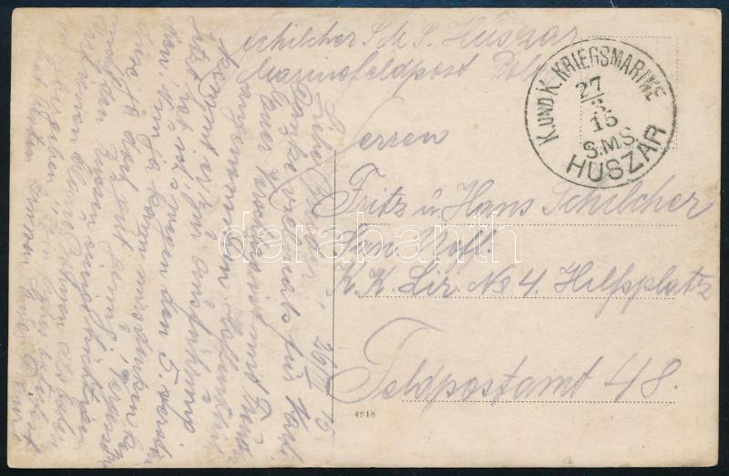 1915 Az S.M.S. S.M.S. Turul, és Huszár osztrák-magyar Huszár-osztályú rombolók a polai kikötőben, Hajóbélyegzővel Fotólap / Black-and-white photo postcard / Three destroyers are docked side-to-side in front of the Krk Hotel (in Pola?) The name of the ship closest to the dock is not visible. The outside ship is S.M.S. Turul. S.M.S. Huszár is between them. A few seamen can be seen in all three, but the lines on both S.M.S. Huszár and S.M.S. Turul are sagging under the weight of their laundry. Addressed to two brothers serving in the K.K. armed forces by a third brother who was a sailor on board S.M.S. Huszár. Full message in German; dated 26/III/15. Postmarked: K. und K. KRIEGSMARINE 27|3|15 S.M.S. HUSZÁR