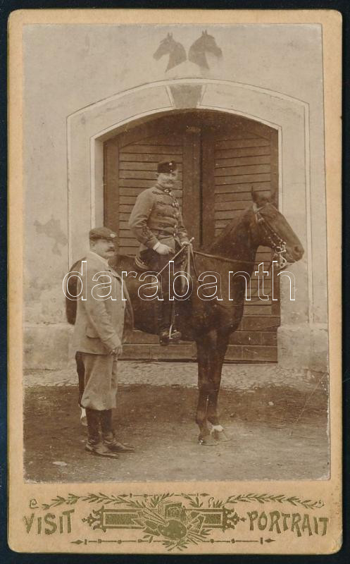 cca 1910 Huszár lovon, istálló előtt, lovásszal, keményhátú fotó, 10,5...