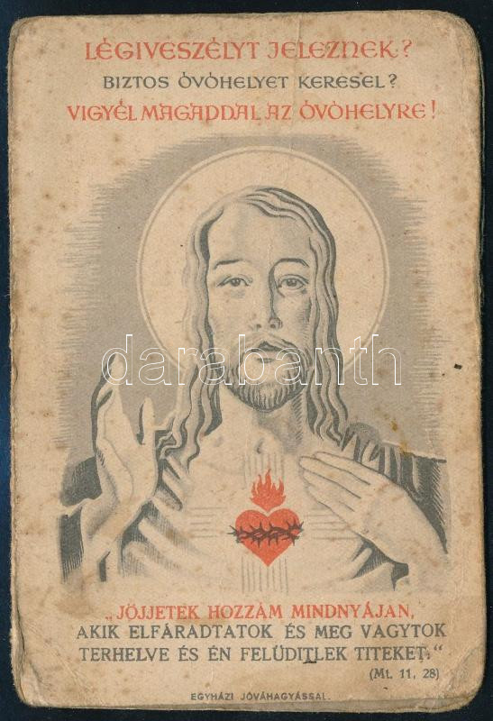 Description: cca 1941-1944 "Légiveszélyt jeleznek? Biztos óvóhelyet keresel? Vigyél magaddal az óvóhelyre? ... Megszólal a sziréna. Mindenhol Isten kezében vagy!" II. világháborús egyházi prospektus, foltos, 2 sztl. lev., 12x8 cm