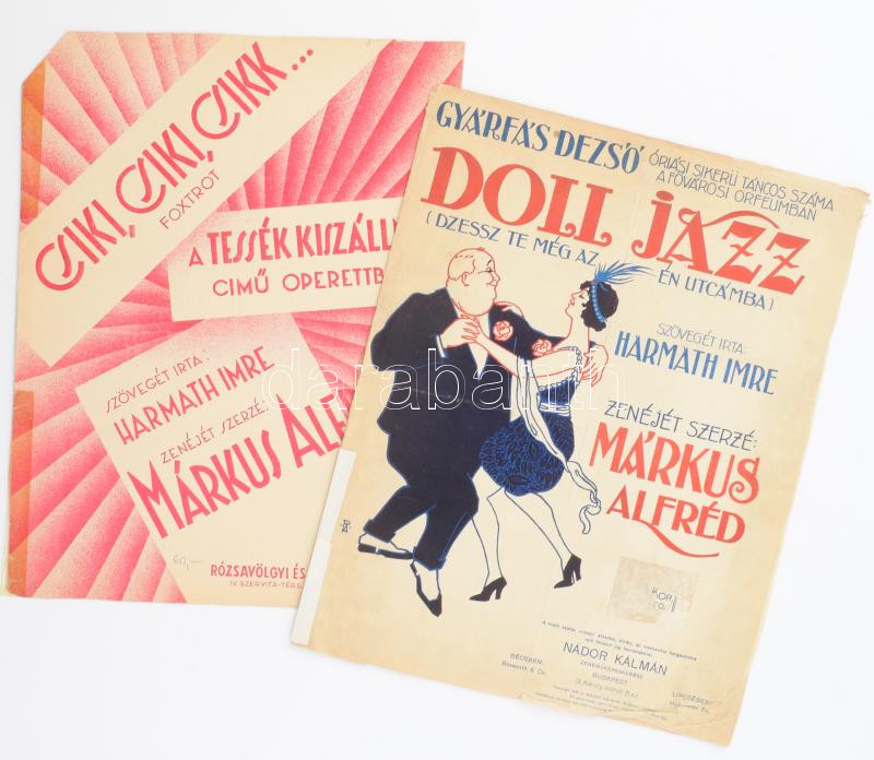 1919-1934 2 db kotta: Harmath Imre - Márkus Alfréd: Doll jazz (Dzsessz te még az én utcámba), 6 p. + Csiki, csiki, csikk.. Foxtrot a Tessék kiszállni! című operettből, 3 p. Sérülésekkel, ragasztottak.
