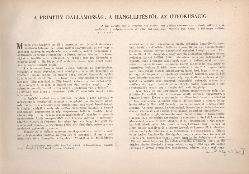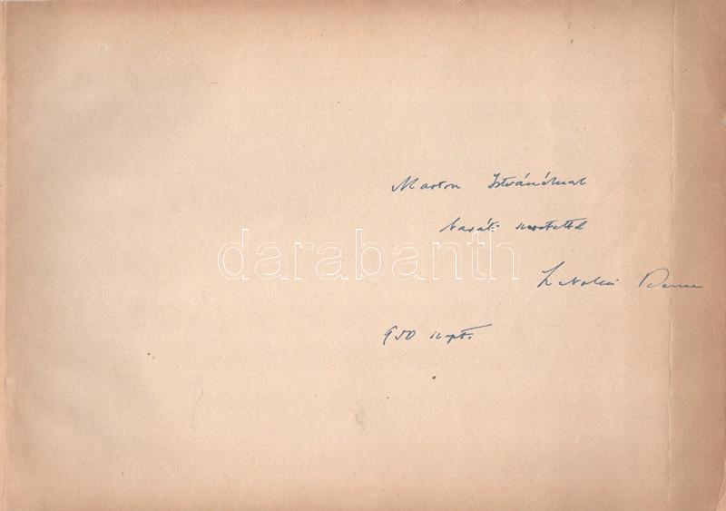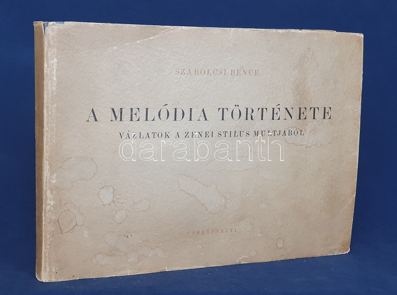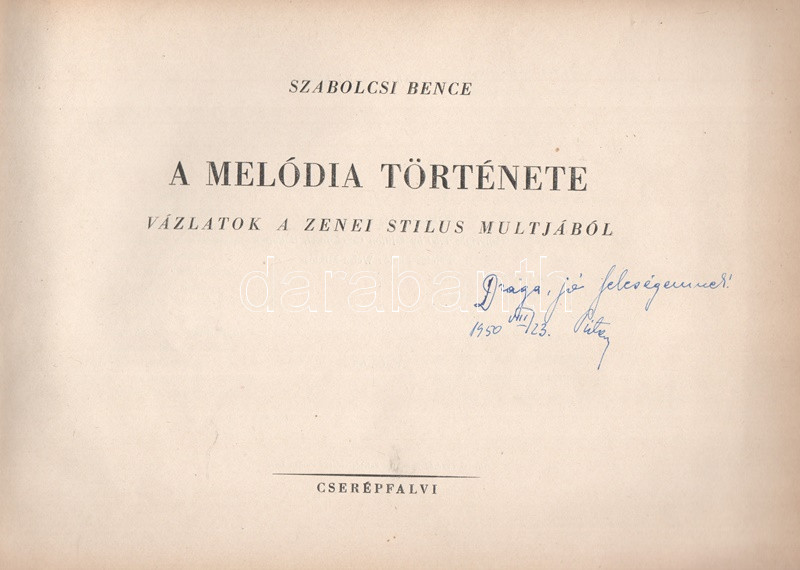 Szabolcsi Bence: A melódia története. Vázlatok a zenei stílus múltjából. (Dedikált.) (Budapest), [1950]. Cserépfalvi Könyvkiadó (Officina nyomda). 157 + [3] p. + 14 t. Haránt alakú kötet. Első kiadás. Dedikált: ,,Marton Istvánéknak baráti szeretettel Szabolcsi Bence. 950 szept". Szabolcsi Bence (1899-1973) zenetörténész, művelődéstörténész összehasonlító zenetudományi értekezése a keleti és nyugati zeneelméleti hagyományok szintézise. Oldalszámozáson belül számos kottával. A címoldalon régi ajándékozási bejegyzés, néhány oldalon ismeretlen kéztől származó széljegyzetek és aláhúzások. Néhány levél fűzése meglazult. Kiadói félvászon kötésben, feliratozott, enyhén foltos kiadói védőborítóban.
