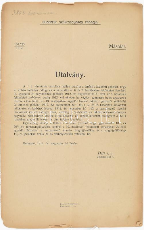 1912 Budapest Székesfőváros tanács által összeállított lista tanárok fizetéséről, közte több neves személyiséggel: Kaffka Margit, Gragger Róbert, Patai József, Benkhárd Ágost, Edvi-Illés Jenő, Turmayer Sándor, gr. Festetics Pál stb. 29 p., kissé sérült.