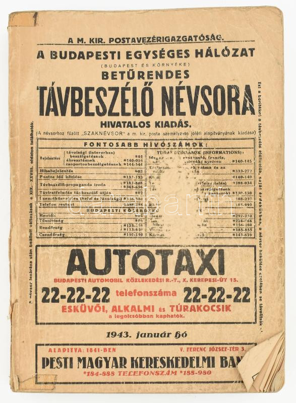 Description: 1943 A M. Kir. Postavezérigazgatóság - A Budapesti Egységes Hálózat (Budapest és környéke) betűrendes távbeszélő névsora, hiányos, megviselt állapotban, 402 p