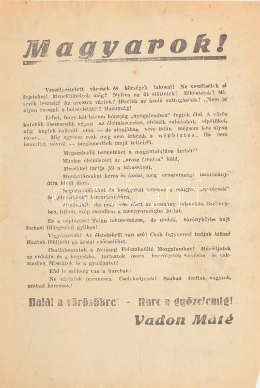 1944 "Magyarok! (...) Halál a vörösekre!", II. világháborús röplap, kisebb lapszéli szakadásokkal, 22,5x15,5 cm