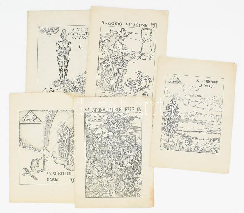 1989 A Hetednapi Adventista Egyház 5 db kiadványa: A múlt csodás városai; Rázkódó világunk; Sorsforduló napja; Az apokaliptikus ezer év; Az eljövendÅ‘ új világ. Kiadói tűzött papÃrkötés, vegyes állapotban.